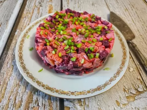 Если используется целая селёдка, ее следует разделать на филе, нарезав на тонкие ломтики, пока овощи готовятся. Далее морковь и свёклу нарезают кубиками, причем свёклу можно порезать так же, как и картошку. Лук мелко шинкуется, чтобы он был менее заметен в готовом блюде, хотя в традиционном рецепте рекомендуется нарезать его полукольцами.