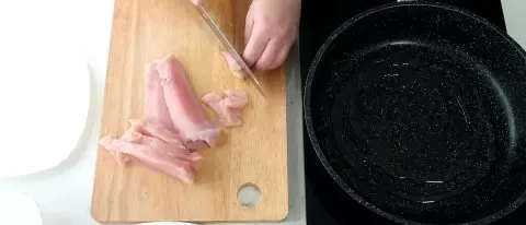 Для начала в разогретую сковороду с растительным маслом помещается нарезанное брусочками куриное филе. Обжарить его нужно со всех сторон до появления легкой золотистой корочки.